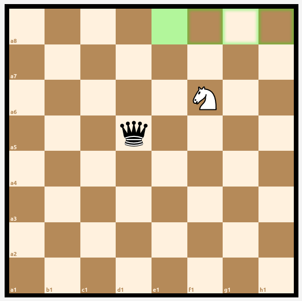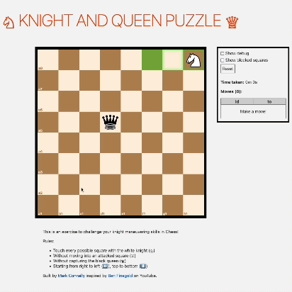 An interactive chess challenge where you move a knight to touch every square without stepping into those attacked by the queen.