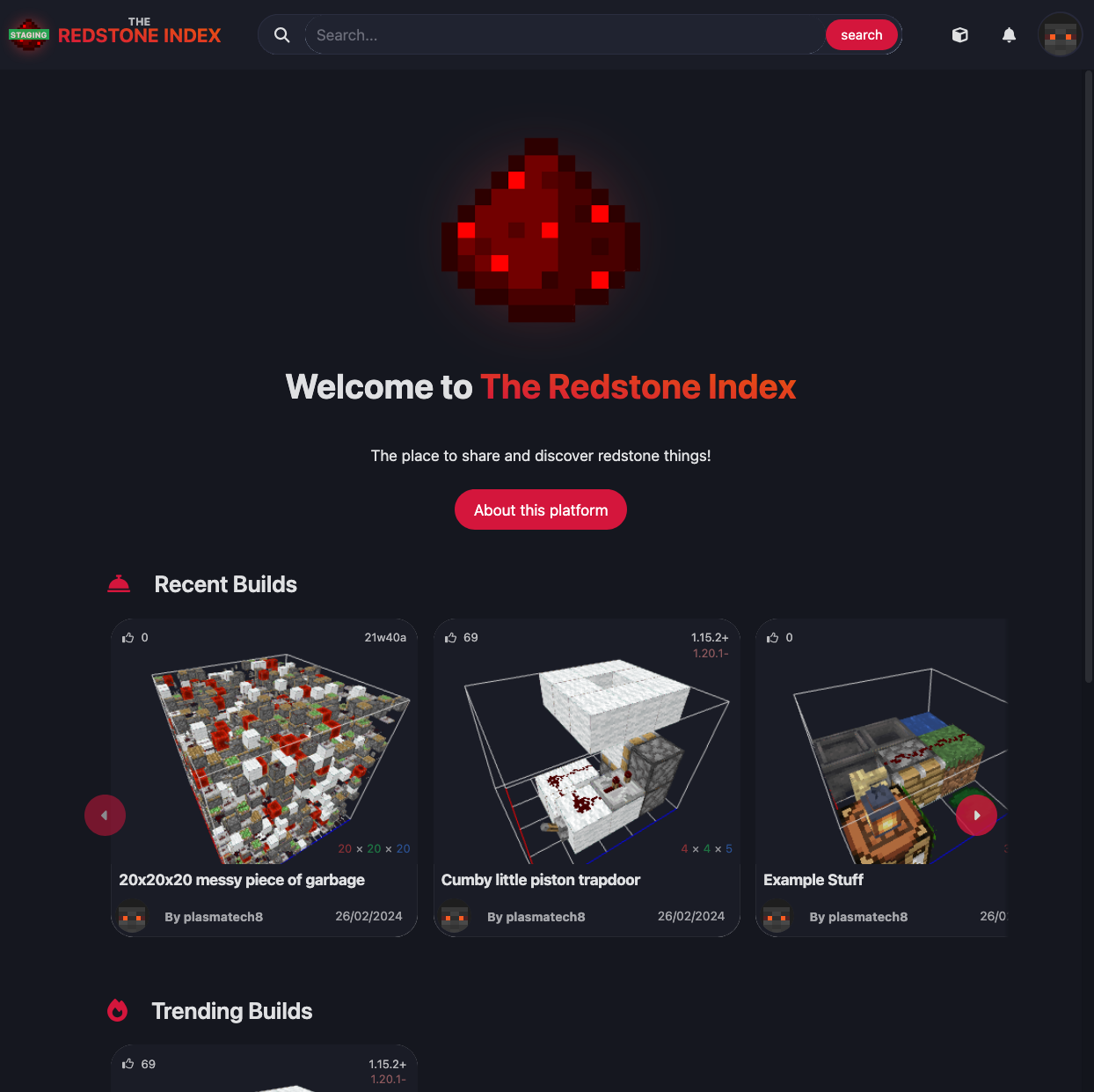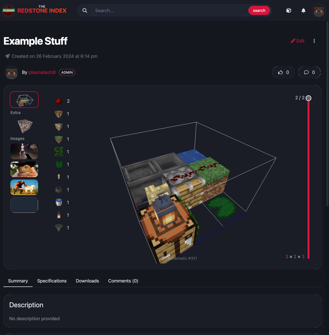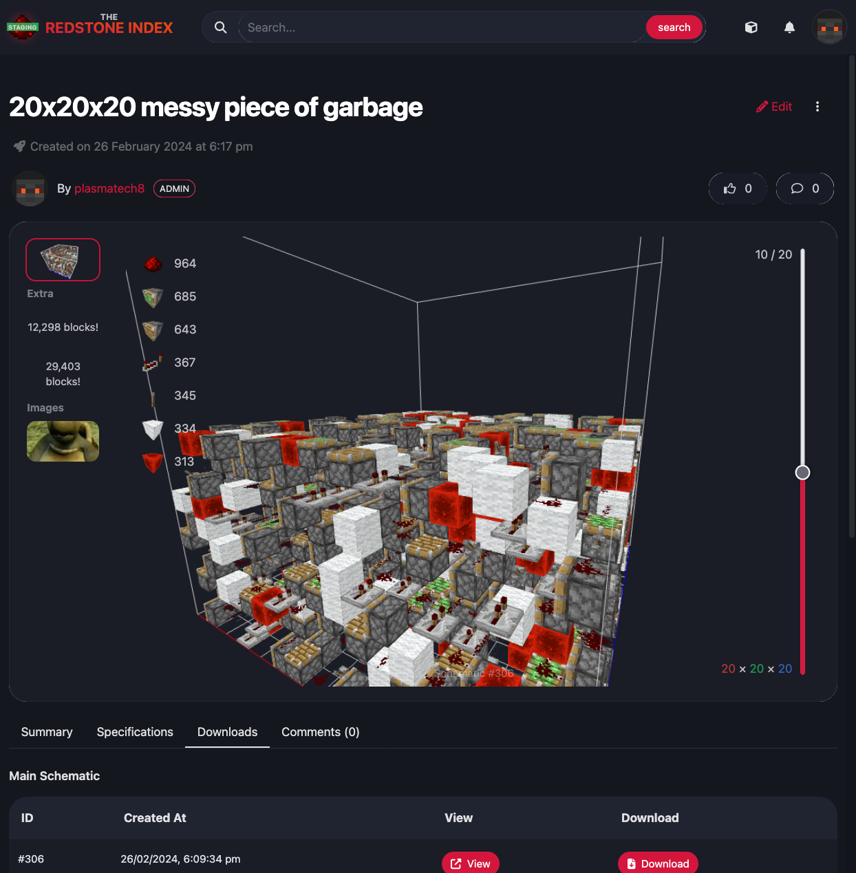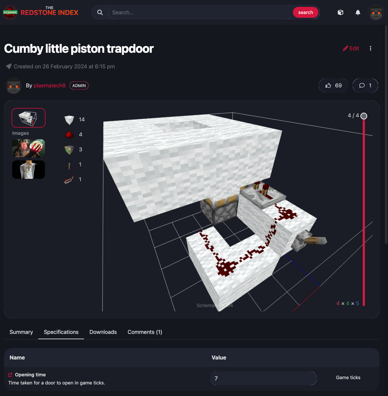 This website lets upload schematics of your Minecraft Redstone circuits, view them in a 3D preview, and explore a catalog of user-submitted builds. You can search and filter results by tags, specifications and version compatibility.